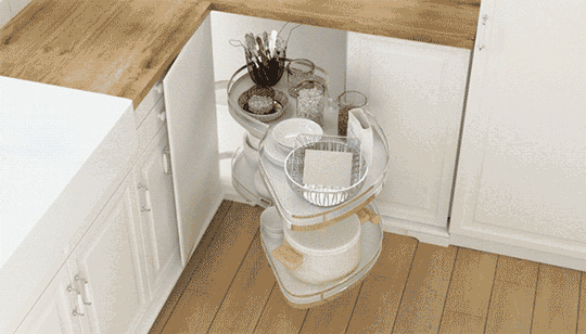 L型和U型橱柜的转角处很容易浪费,装旋转拉篮或转角抽屉可以完美解决。
