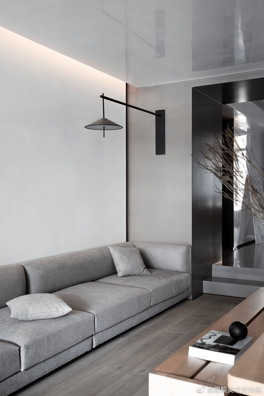通过材质与色调之间的切换,与玄关进行了空间分隔。打破传统常规的住宅设计模式,摒弃电视背景墙,没有惯性设计的围坐式沙发。用白色的艺术漆墙面与天花营造干净舒适的环境,灰色的木地板地面均衡了空间的黑白视觉对比。