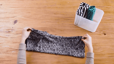 △将裤子对折,把裤脚卷起塞到腰部,可以很大程度的减少收纳裤子所用的空间。