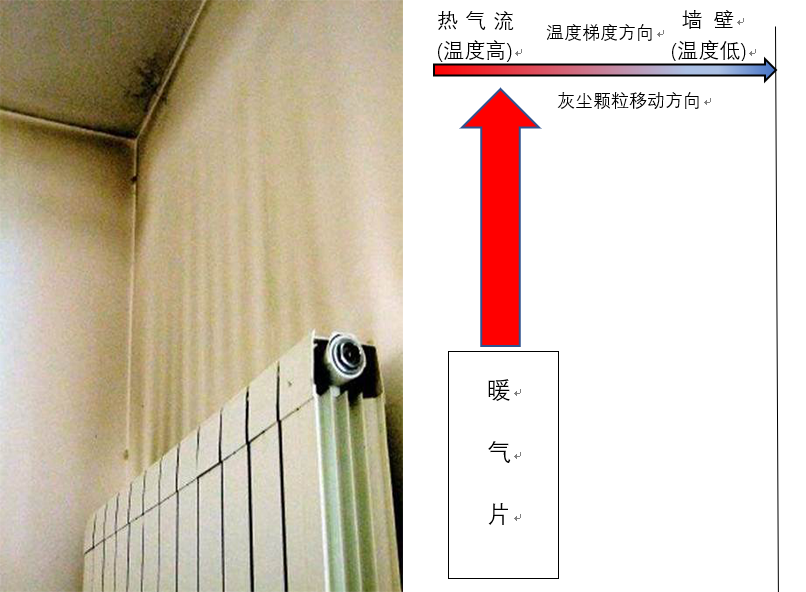 熏黑的原因不是买到了山寨的星欧娱乐,而是所谓的热泳现象,又叫索瑞特现象:在流体中有稳定温度梯度存在时,流体中的固体颗粒会朝着温度较低的方向运动。定性来看,高温区域流体分子运动更剧烈,对固体颗粒的撞击力更大,就把固体颗粒“推”到低温的地方去了。简单来说,因为星欧娱乐和它背后/上方的冷墙面有温度梯度,空气在流过它们之间时,颗粒物会吸附到较冷的墙面上,导致墙壁被熏黑了。