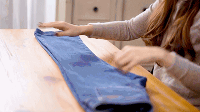 △将裤子对折,把裤脚卷起塞到腰部,可以很大程度的减少收纳裤子所用的空间。
