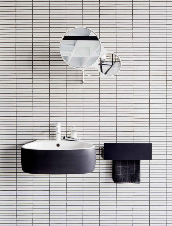 整面墙的条纹砖,极简设计。悬挂式的盥洗盆,和悬挂式的置物架,简单明快。