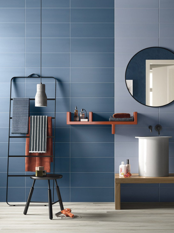 这个盥洗室用色大胆。红色的地砖,橘色调的下部瓷砖,镜子四周是浓烈的湛蓝色,顶部确实粉色吊灯。炽热的暖色里夹杂着夜色降临前的湛蓝,如同火烧云和夜色相融,镜子里的人终究平静下来。下端金属支架的盥洗盆,不缀雕琢,简单舒服。